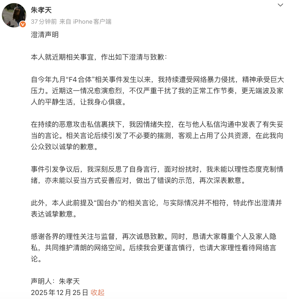 今晚(12月25日),朱孝天在个人社交账号发布“澄清声明”,全文如下: