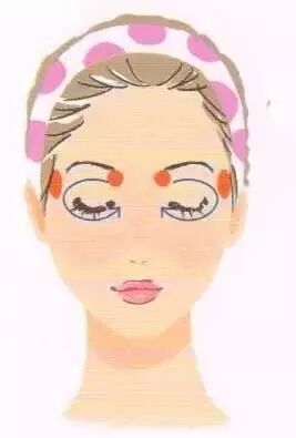 STEP 2:用双手中指和无名指的指腹,沿着眼周按压,眉头和太阳穴加重按压。