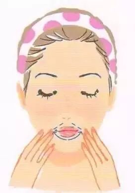STEP 4:用双手无名指,沿着嘴角上扬的方向,在唇周提拉按摩。
