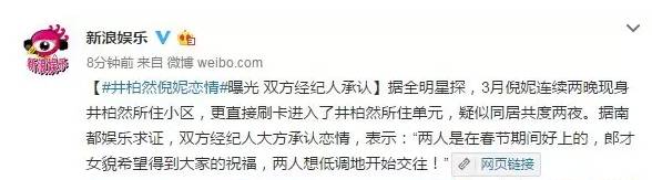 根据报道,3月3日深夜,倪妮拍完戏后乘车来到井柏然所住小区。4日下午,井柏然一身黑衣出门,直至凌晨才返回小区。当晚,倪妮收工再度现身该小区,更直接刷卡进入了井柏然所住单元,直到凌晨也未离开。