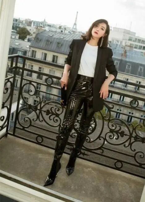 尖头高跟搭配亮闪皮裤不仅突出宋茜双腿细直曲线,更将拽炫酷的姿态完美展现。上半身小西装外套的穿法同样范儿超足,倚靠栏杆的pose潇洒不羁,耐人寻味。就问你们,这样的宋茜帅不帅!