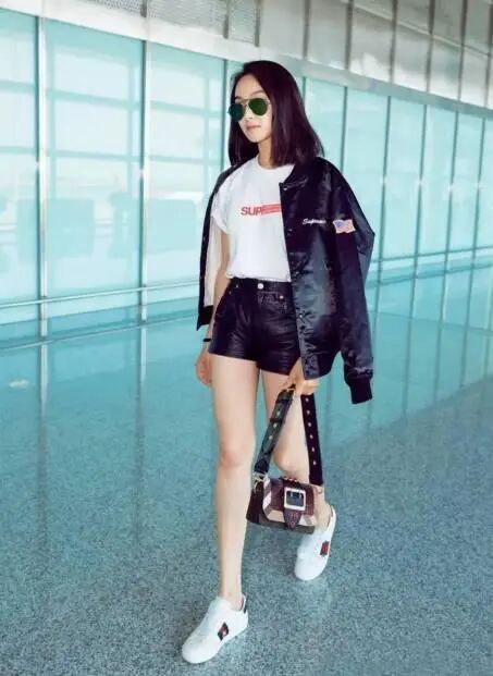 黑色夹克披在肩膀上增添气场,虽然搭配了很清新的小白鞋,但严肃深情自己整体服装的色调和气场,无一不在彰显潇洒个性的女神姿态。