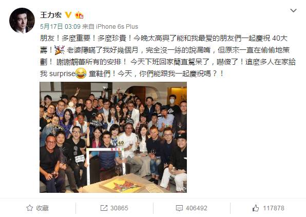 可以看出力宏字里行间都洋溢着兴奋快乐之情。粉丝们也是十分给力,在微博留言40万祝福表白,来庆祝力宏40岁生日。