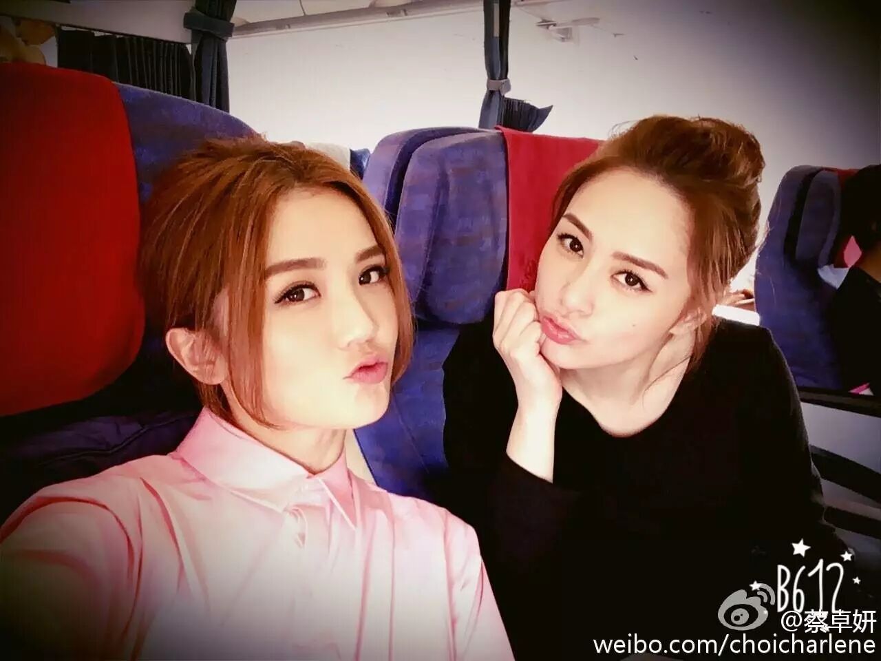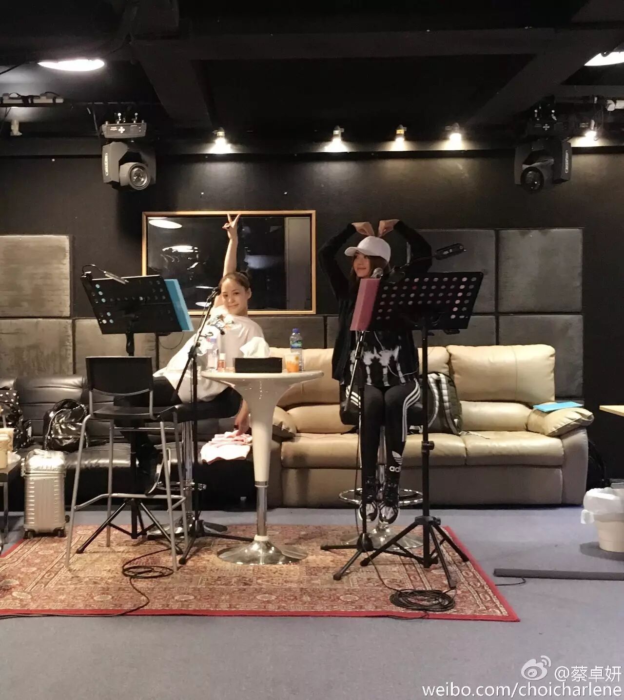 Twins组合蔡卓妍通过微博晒和阿娇在录影棚搞怪合影,并纪念两人相伴走过15年。