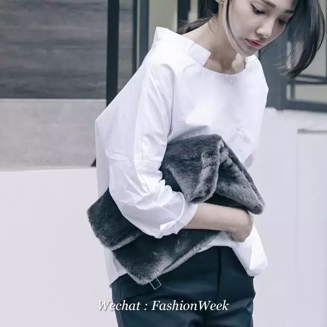 超带感的一件白色衬衫,出自 Blunt Studio,裤子同样来自#nude。这只毛茸茸的手包?是Zoeyf studio的作品啦!相信你已经能感受到这个漂亮的小妮子有多热衷原创设计品牌。