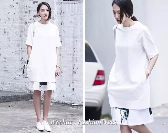 这件白色长款T恤来自台湾的原创设计品牌iohll, 念法很特别:[`aɪo]。说到名字的灵感来源更是令人会心一笑,前半部分“io”源于一个象声词,当你碰上惊奇有趣的事情发出的声音,想象下呗~后边的h.l.l.则是三个主设计师英文姓氏的首字母。内搭的印花裙同样来自台湾新锐设计师的品牌Fabitoria。由此可见,小美对本土设计师品牌钟爱有加。nudité的鞋子,3.1 Phillip Lim的包包。这套装束很学生风,喜欢小清新的妹子可以学学哦~