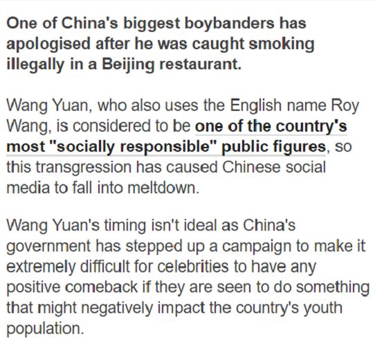 中国最高人气男团之一的成员王源,被抓拍到在北京的餐厅非法吸烟,随后致歉。王源的英文名是Roy Wang。他被认为是中国“最有社会责任感”的公众人物。因此,这次违规事件引来社交媒体上的一片哗然。