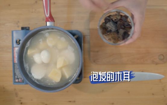 将提前准备好的萝卜、土豆、鸡蛋、木耳等食材按照易熟程度放入鸡汤中。