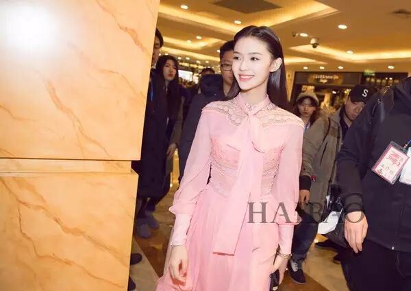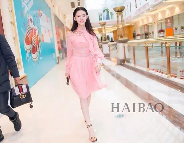 粉色这样粉嫩的颜色很是适合青春洋溢的林允,古驰 (Gucci) 的蕾丝连身裙搭配金色亮片的一字高跟鞋不仅不显突兀还衬肤色。