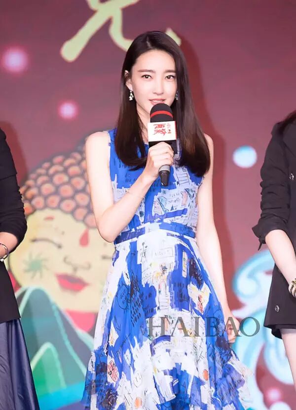 王丽坤一袭蓝色印花纱质长裙,下摆层层叠叠错落有致大方得体。