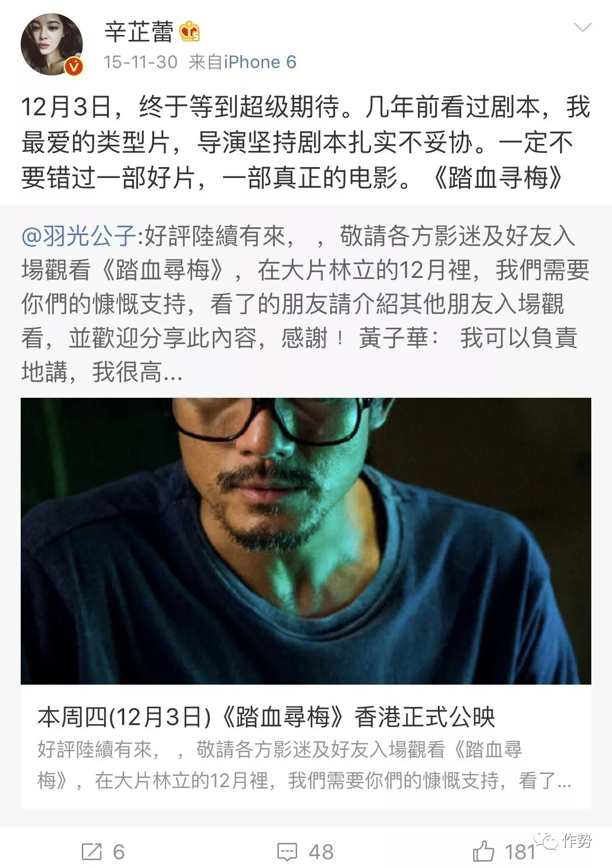 虽然错过了这一宝贵的机会,她还是在微博上推荐了《踏血寻梅》。