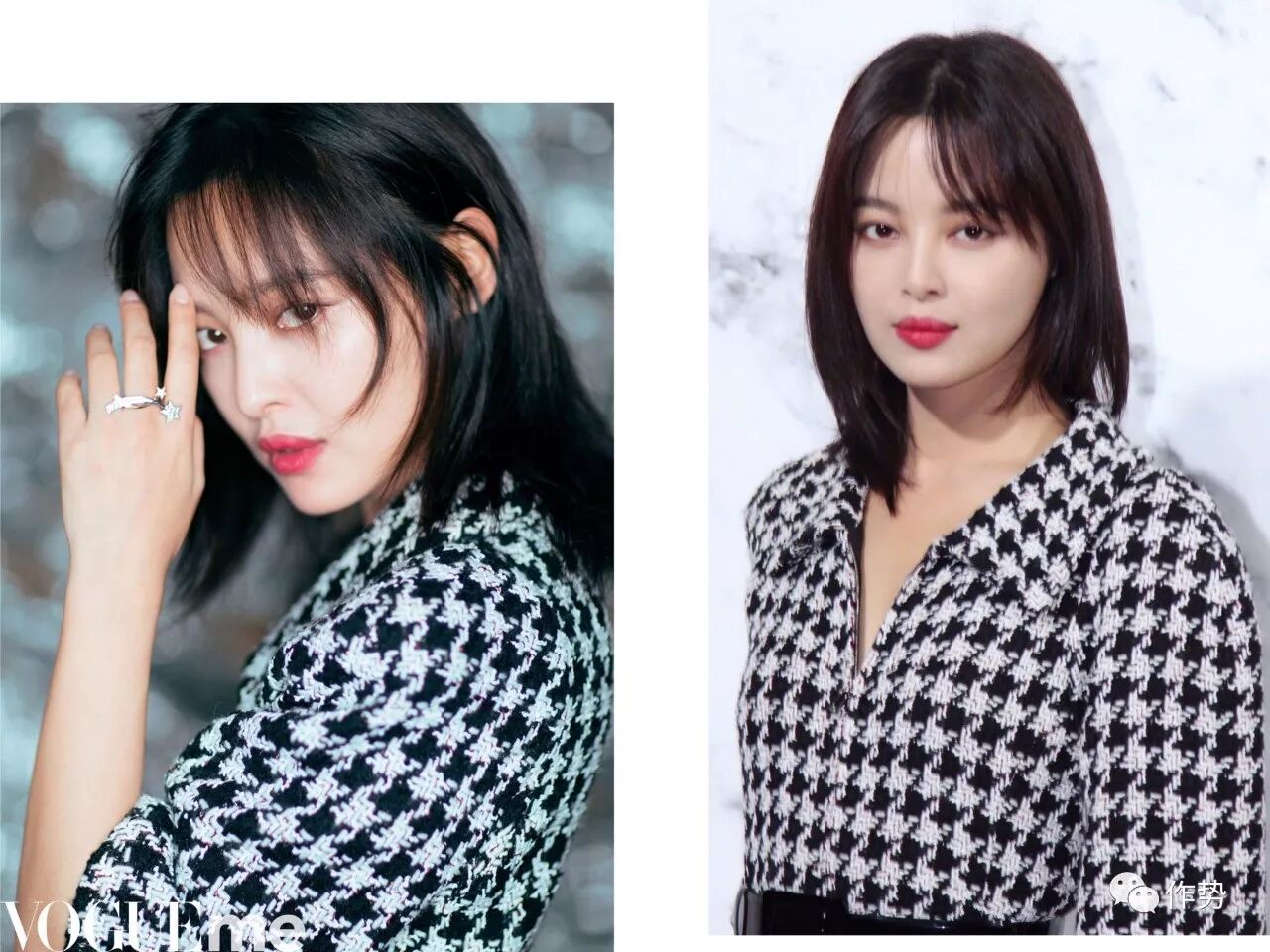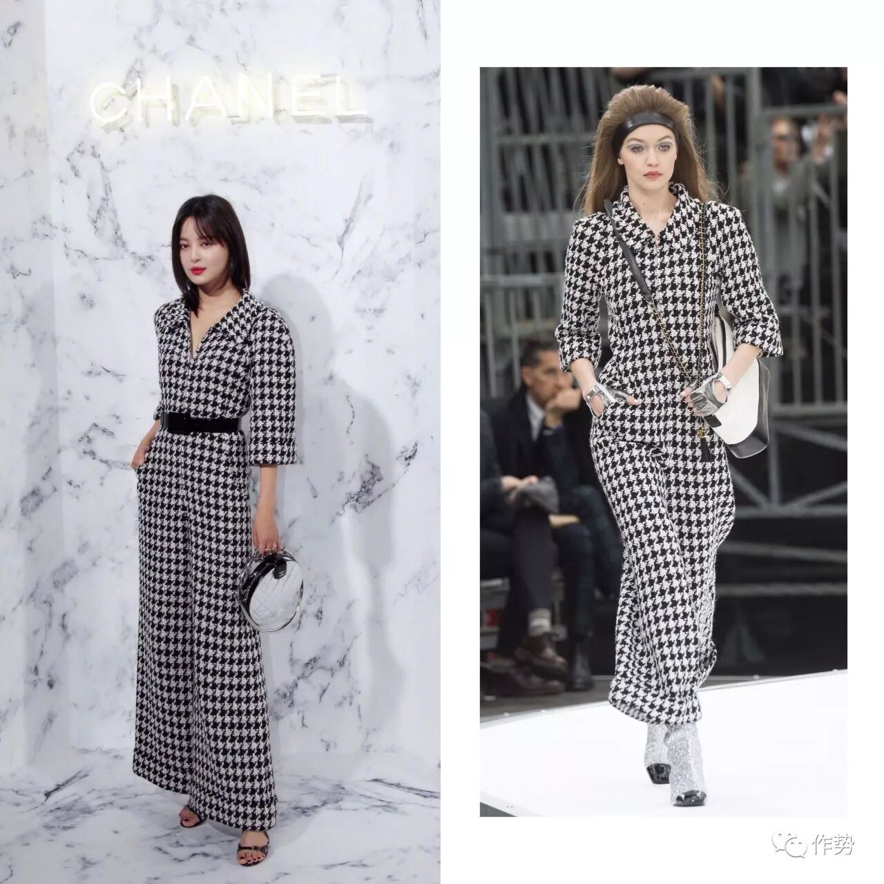 最近作势君去了Chanel的成都大秀,她也在场。当天她穿了香奈儿的2017秋冬千鸟纹套装,在秀场是Gigi Hadid演绎的那套。