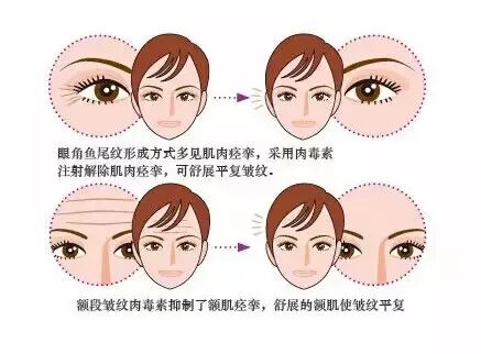 肉毒素的除皱主要原理是:将收缩造成皱纹的肌肉软化,使肌肉不收缩,连带的也去除了皱纹。