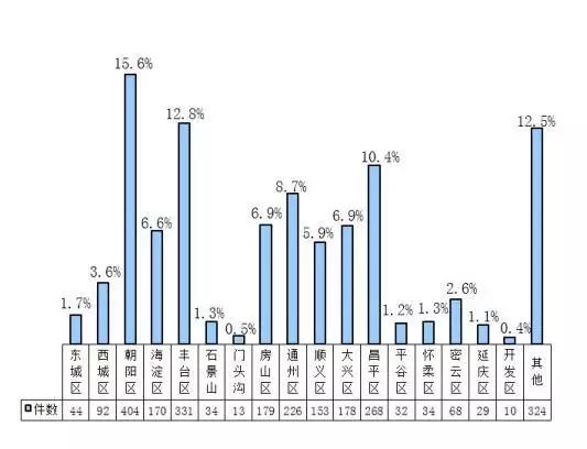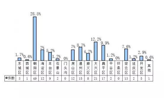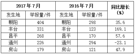 从发生地来看,2017年7月群众反映环保诉求数量较多的分别是朝阳区、丰台区、昌平区、通州区和房山区。