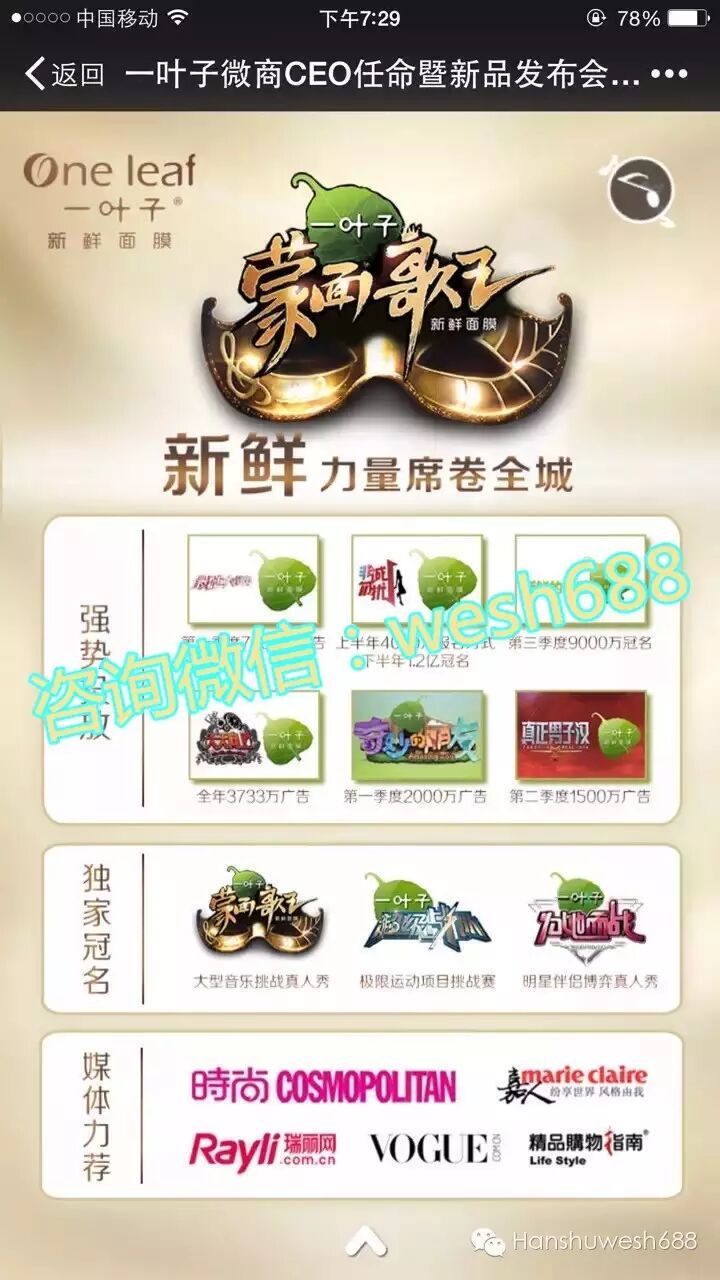 随着一叶子面膜冠名江苏卫视蒙面歌王,我们期待已久的一叶子肌润多效微精华面膜礼盒也火热上市了!韩束微商总代咨询微信 wesh688