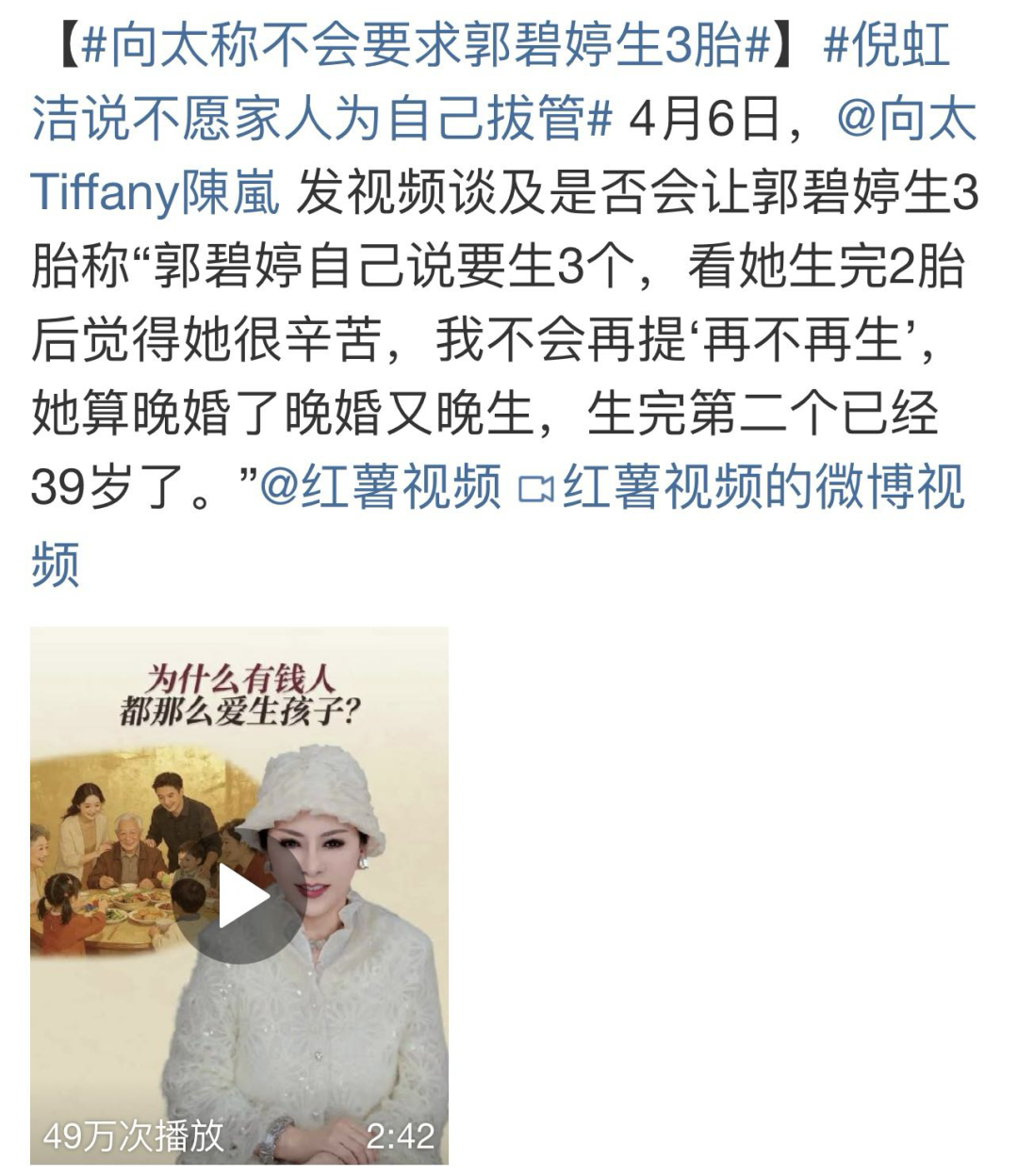 前阵子向太发视频,谈及是否会让郭碧婷生三胎。
