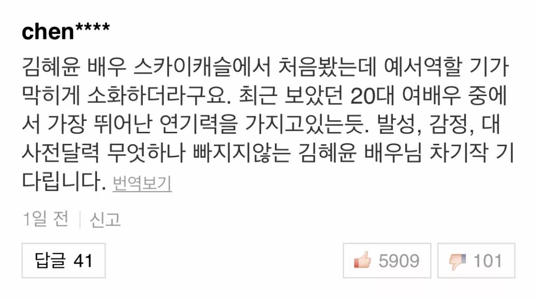 热评第一:第一次在《天空之城》见到金惠允,就觉得她把扮演的角色消化得非常完美。应该是最近看到的20代女演员中演技最出色的。金惠允演员的发声,感情,台词的表现力都毫不逊色,期待她的下一部作品。