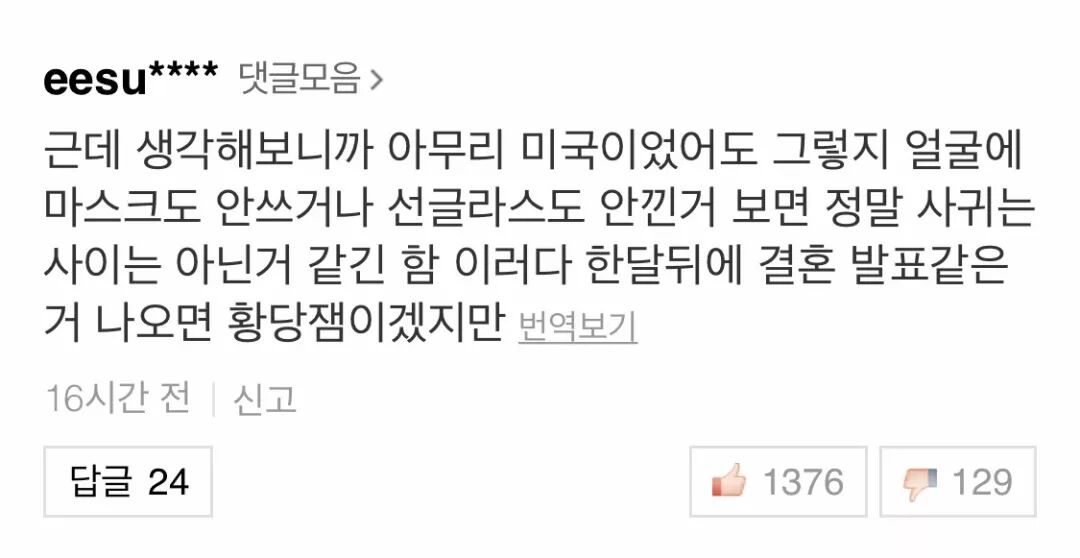 热评第一:但是想想看,就算在美国,从脸上没有戴口罩、墨镜来看,好像真的不是交往的关系,这样下去如果一个月后出现像发表结婚消息之类的事情的话,那就太荒唐了。