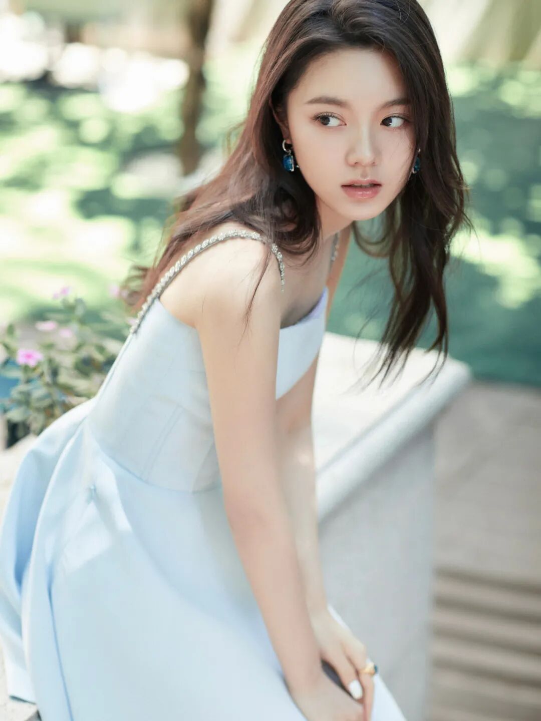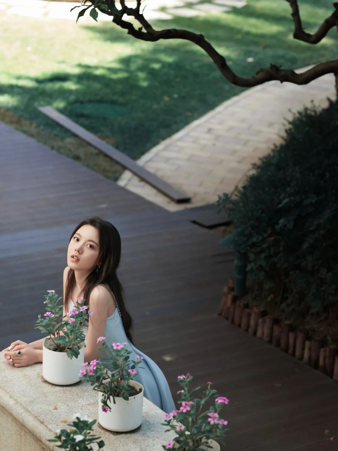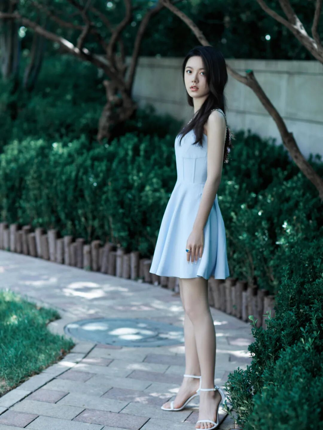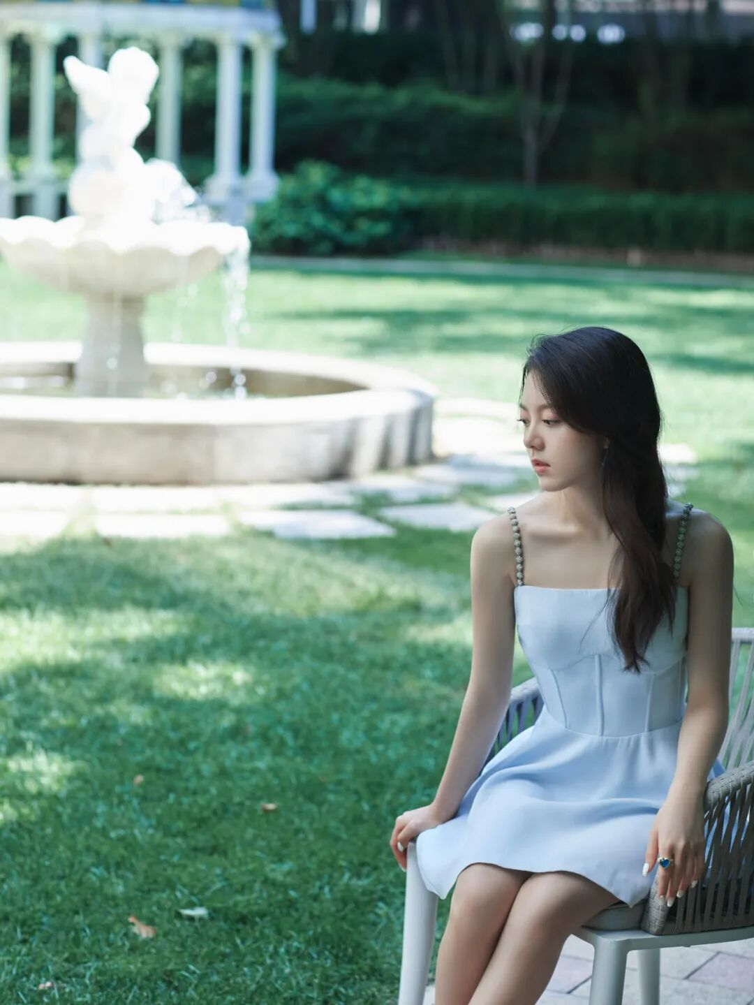 赵今麦端坐户外,姿色倾城。一袭浅蓝短裙,无袖设计,尽展玉臂纤纤,裙摆轻盈,宛如微风拂柳,摇曳生姿。足蹬白色高跟,亭亭玉立,更显身姿挺拔,气质如兰。