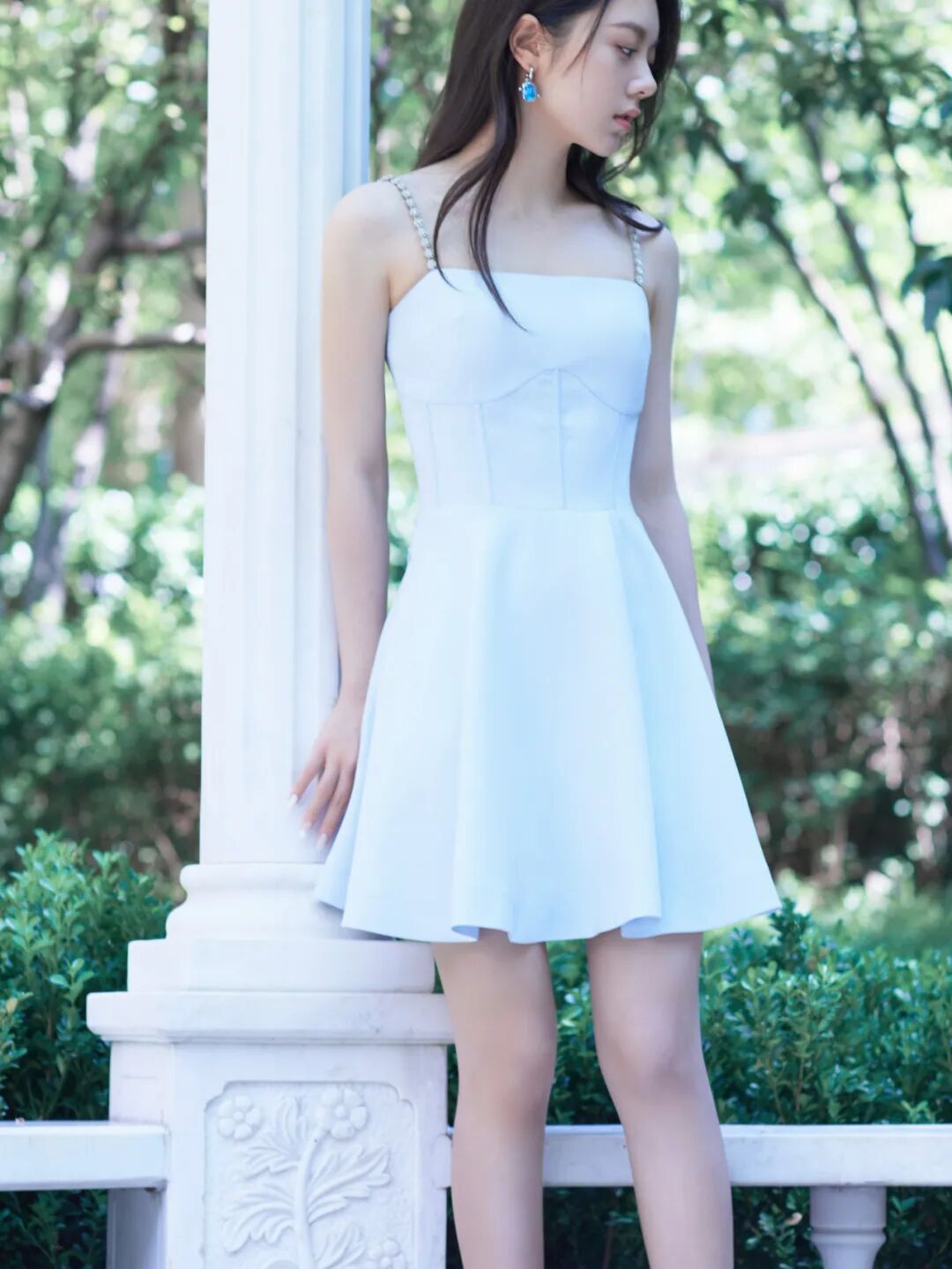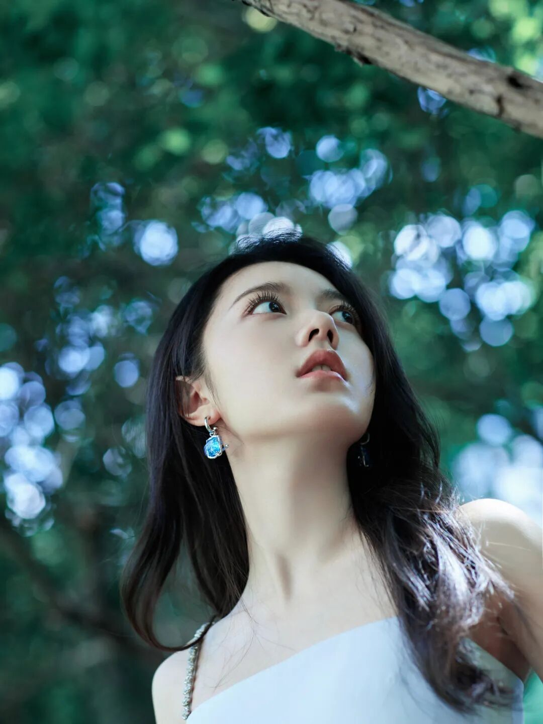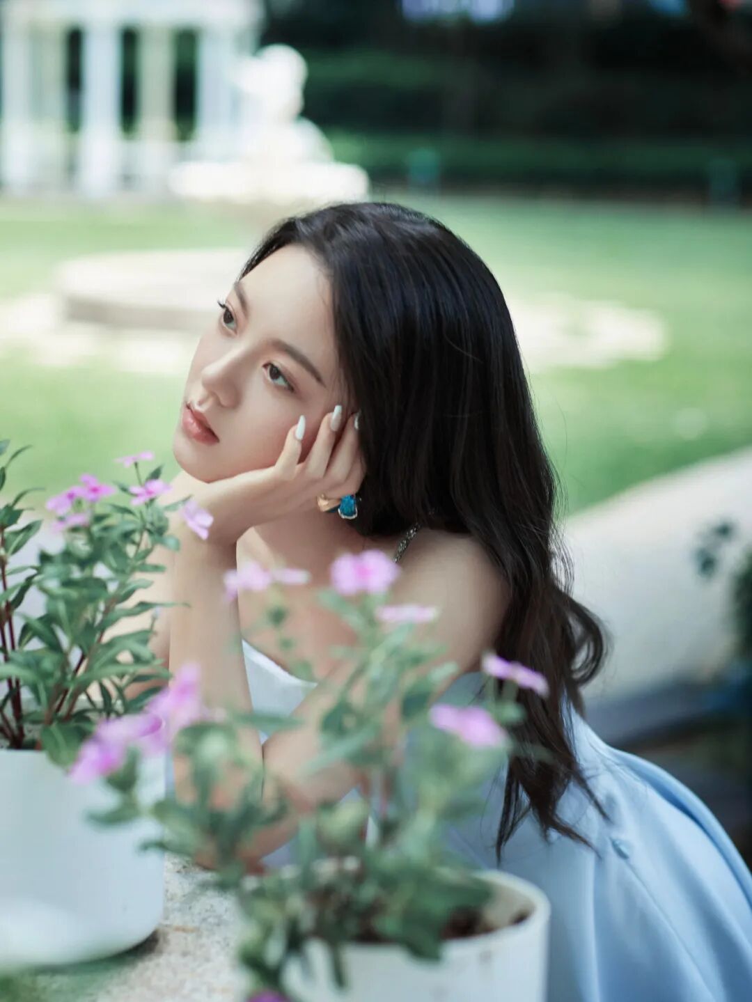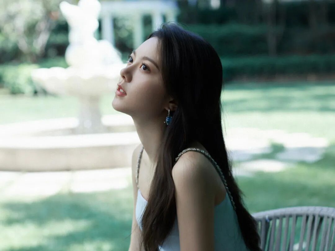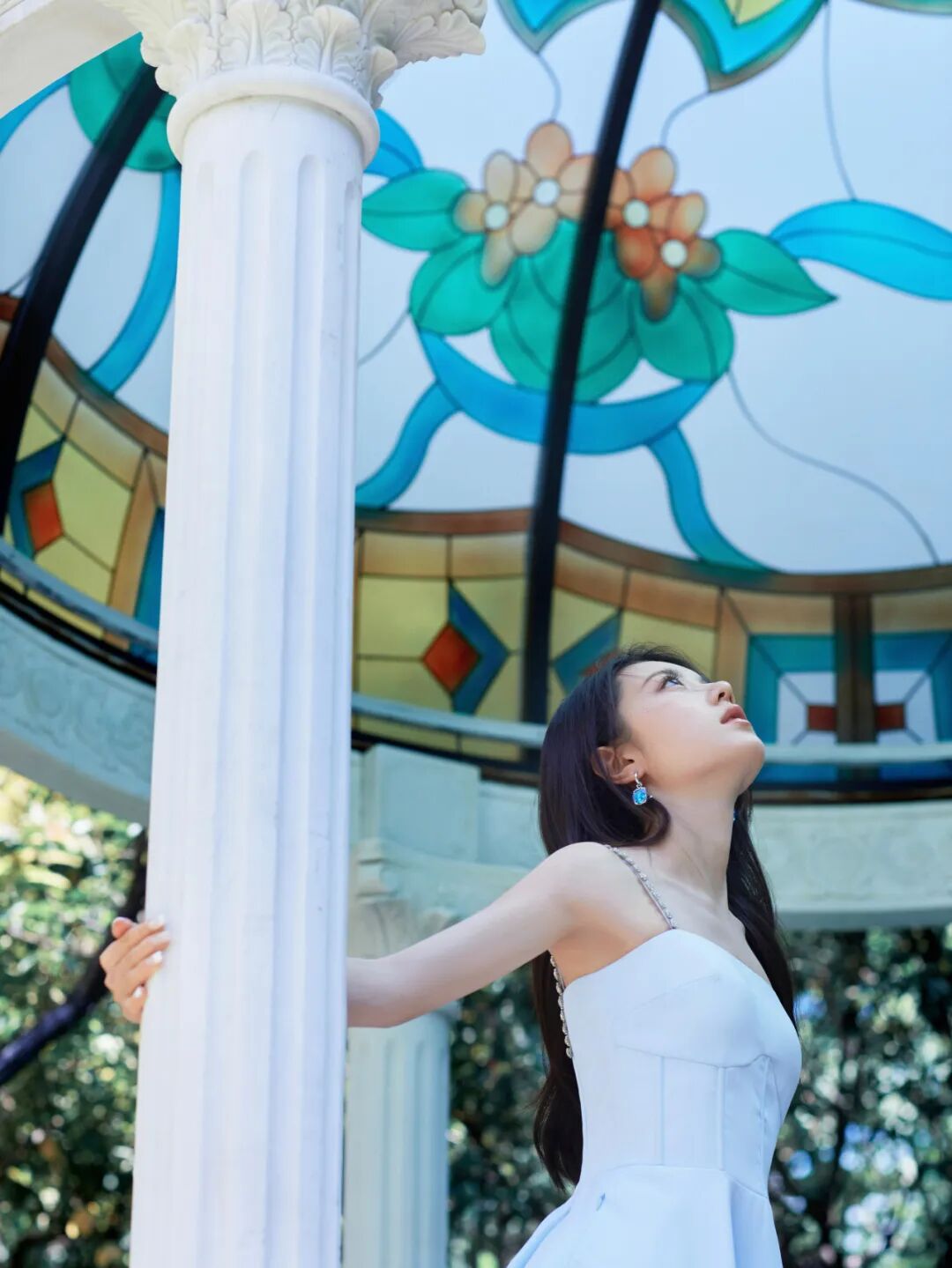 赵今麦端坐户外,姿色倾城。一袭浅蓝短裙,无袖设计,尽展玉臂纤纤,裙摆轻盈,宛如微风拂柳,摇曳生姿。足蹬白色高跟,亭亭玉立,更显身姿挺拔,气质如兰。