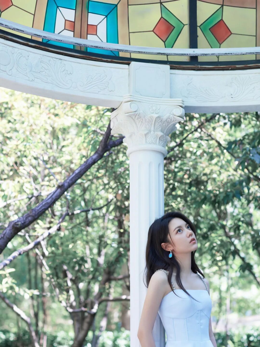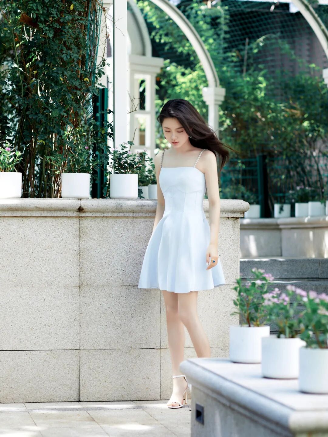 侧身而坐,双腿微曲,一脚轻踏于地,尽显闲适惬意之态。背景绿植掩映,建筑错落有致,阳光洒落,温暖而明媚。赵今麦此番穿搭,宛若仙子下凡,气质高雅。是“短裙高跟显身姿,气质如兰胜仙子”也。
