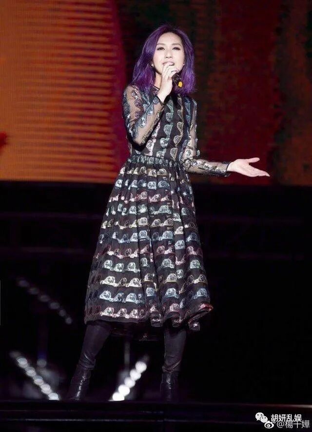 一袭印花透视中长裙+黑色长靴,杨千嬅也太爱紫色染发了吧,不过我们得不得承认这样的她很迷人!