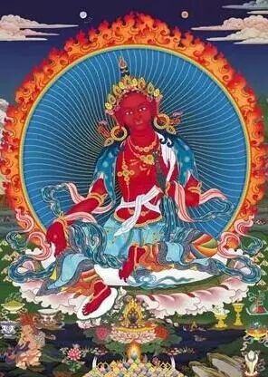 烈焰度母:也叫胜敌度母。身体红色,右手结胜施印,左手持金刚杵。她安住在末劫火般的光鬘中,呈右腿伸、左腿屈的欢喜姿态。
