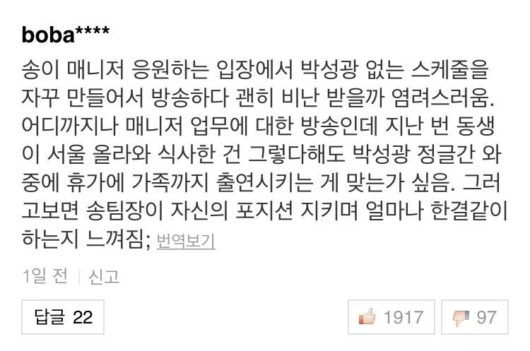 站在支持松儿经纪人的立场上,总是拍摄和播出没有艺人朴成光的内容,有点担心她会不会受到非难。到哪些程度是经纪人业务范围内的内容,是不是应该播出,比较担心。上次拍的部分也是,朴成光去参加《丛林》,她家人来到首尔一起出演节目,一起吃饭,不知道这个究竟合不合适。这样看来,也能感受到(李英子经纪人)宋组长为了守住自己的定位,前后的行为保持一致,有多么辛苦。