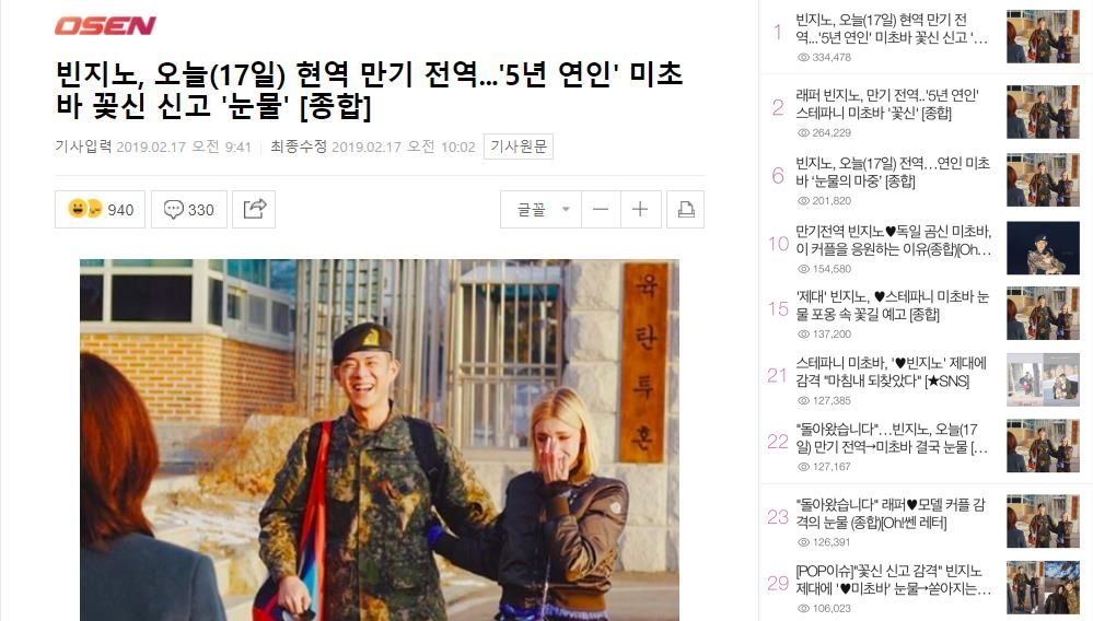 (17日,Rapper Beenzino在江原道铁原6师团青城部队服役1年零9个月后正式退伍,恋人Stephenie Michava迎接他,激动大哭。Beenzino原名林胜斌,和德国模特出身的女友已相恋5年。)
