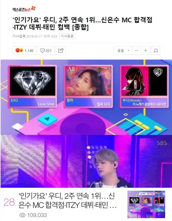 (《人气歌谣》是SBS的音乐打榜节目,上周歌手Woody得到一位,除了音源这一项,各项投票都是零分,因为音源刷榜,受到网友质疑。本周一位候补EXO、金请夏,Woody,一位依旧由Woody获得。)