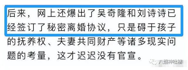 还提到,吴奇隆和刘诗诗其实私下已经秘密签了离婚协议,但是碍于儿子的抚养权、以及夫妻身上的代言,所以目前还不能对外公布。对于这种事情,其实在娱乐圈也算常见,不少明星夫妇会因为代言等问题先不公开离婚,等合约到期后再公开离婚。