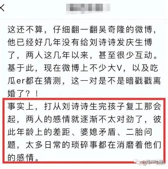 据知情人士爆料,其实在刘诗诗生完儿子后,她与吴奇隆的感情就发生了一些变化,而且两人的年龄差距也比较大,在加上婆媳矛盾、日常琐事,这些所有的事情合在一起,才让他们的婚姻出现问题。