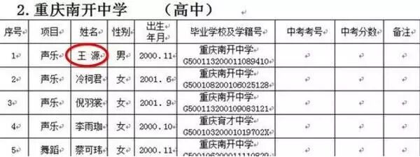 重庆市教育委员会公布了《2016重庆市中学生艺术团招生拟录名单》,在声乐组别中,TFBOYS王源位列重庆南开中学(高中)艺考名单第一位。