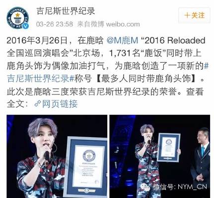 接下来就是wuli鹿晗Reloaded巡演,北京首站的演唱会现场,小鹿同志第三次获得吉尼斯世界纪录,此次挑战的纪录为:最多人同时戴鹿角头饰,挑战目标人数是351人,这个纪录此前是2013年在英国创造的。