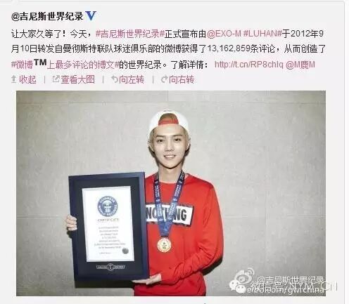人家这娃第一次获得吉尼斯世界纪录是在2014年8月5日,鹿晗在2012年9月10日转发自曼彻斯特联队球迷俱乐部的微博共获得了13,163,859条评论,首次创造了上最多评论的博文的纪录称号。