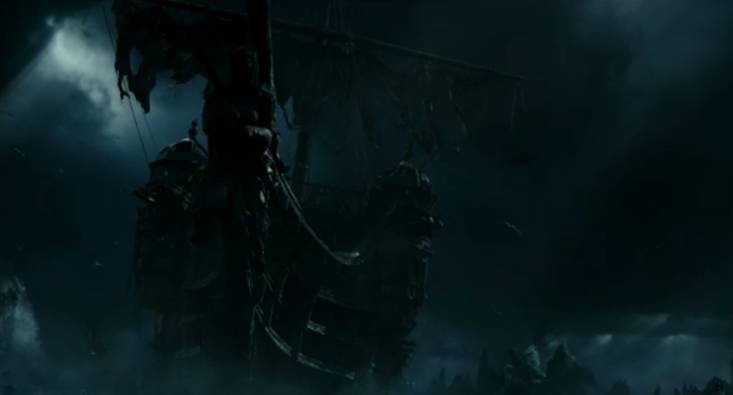 在预告片中,反派萨拉扎的船巨大而诡异,在暗蓝色的海洋中直逼巴博萨船长的黑珍珠。
