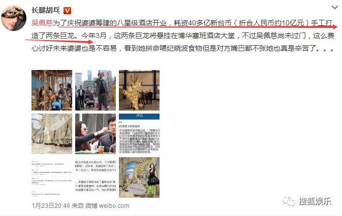 今天有爆料称,吴佩慈为了庆祝婆婆筹建的八星级酒店开业,斥资40亿新台币(约10亿人民币)为婆婆的酒店打造了两条巨龙。