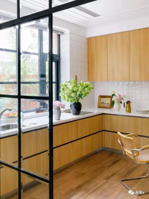 厨房整体干净明亮,不仅最大限度引进户外光线,玻璃轻贡隔断的设计也将客厅的光线引进厨房,关上门之后,又不用担心油烟跑到客厅。原木风橱柜让家里充满田园自然感,丰富的花草让 下厨成为一件美妙的事。