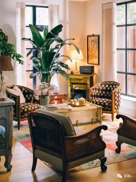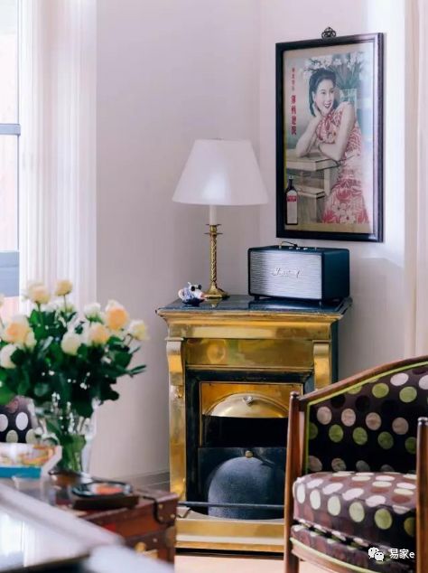 客厅的会客一角,静初常爱在客厅的这个角落招待自己的朋友。大部分家具都是 她花了大量心思,从国外旧货市场淘回来的心爱之物。波点单人沙发椅是来自法国的古董,角落的壁炉也是静初亲自从法国淘回来的。