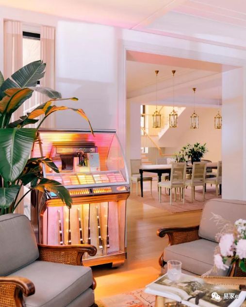 很多人梦想着有个花园式的咖啡厅,张静初把它实现在家里了。从会客区望向餐厅,近处五彩缤纷的点唱机是一个1953年的老物件,是静初从法国购买的。三五好友前来聚聚,是多么惬意的事情。