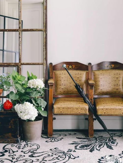 玄关处摆放着老电影院式座椅的沙发,一把复古雨伞是张静初在维也纳拍戏时淘来的。窗棂铁锈斑驳搭配着木边几和素雅鲜花,充满历史感和复古感。 张静初很喜欢这些老物件,感觉放在家里很亲近很有人情味。