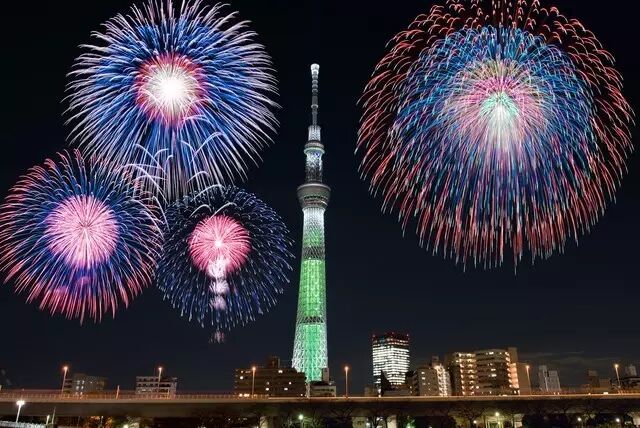 其实,与上次赏樱花一样,这次两人也是来看花的。不过,这花不是长在地上的,而是开在天上的。七八月份日本各地都有烟花大会,最为热烈的当属东京隅田川的烟花大会,花火与“天空树”遥相呼应,好不美妙。