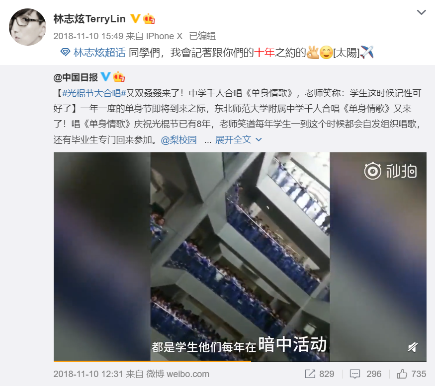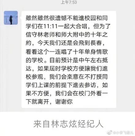 参加的学生越来越多,场面越来越壮观,也陆续有媒体报道了此事。2018年,林志炫通过微博得知此事,并当即立下“十年之约”——在这项校园活动进行到第十年、也就是2020年的11月11日,他会亲赴东北师大附中,与同学们一起唱这首歌。