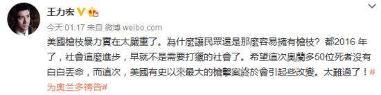 王力宏:美国枪枝暴力实在太严重了。为什么让民众还是那么容易拥有枪枝? 都2016 年了,社会这么进步,早就不是需要打猎的社会了。希望这次奥兰多50位死者没有白白丢命,而这次,美国有史以来最大的枪击案终于会引起些改变。太难过了!