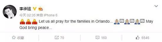 李承铉:Let us all pray for the families in Orlando…May God bring peace…(让我们为奥兰多的家庭祈祷,愿上帝带来和平。)