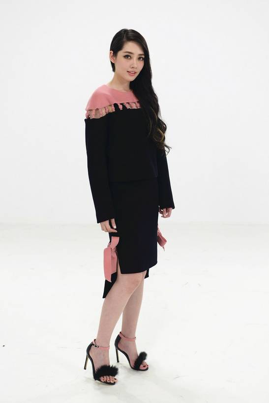 黑色与粉色的拼接裙装+蝴蝶结元素