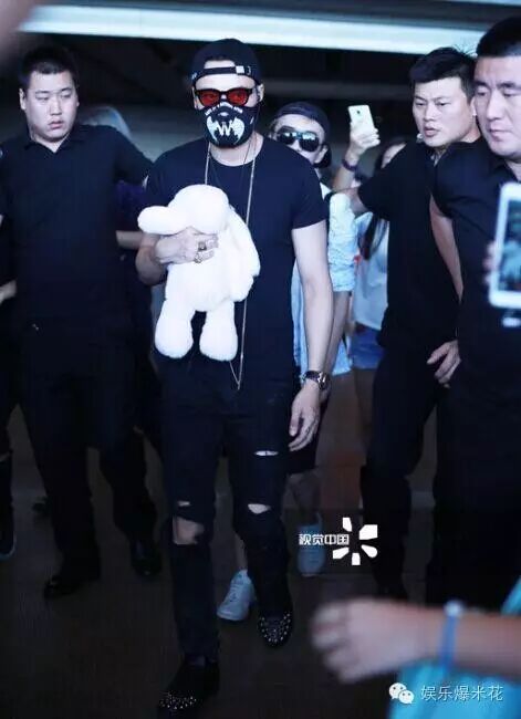 陈伟霆全黑造型现身北京机场,反戴黑色帽子、配红色墨镜及演唱会周边口罩。