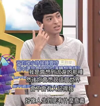 安钧璨也提起,他从小就爱胡思乱想,国小一二年级就想过:“人为什么要来到这个世界上?”后来有一阵子停止思考这件事,但最近又开始想。他在节目上 说:“闭上眼睛,这个世界会不会有人记得我,然后都没有,再从两侧流泪。”