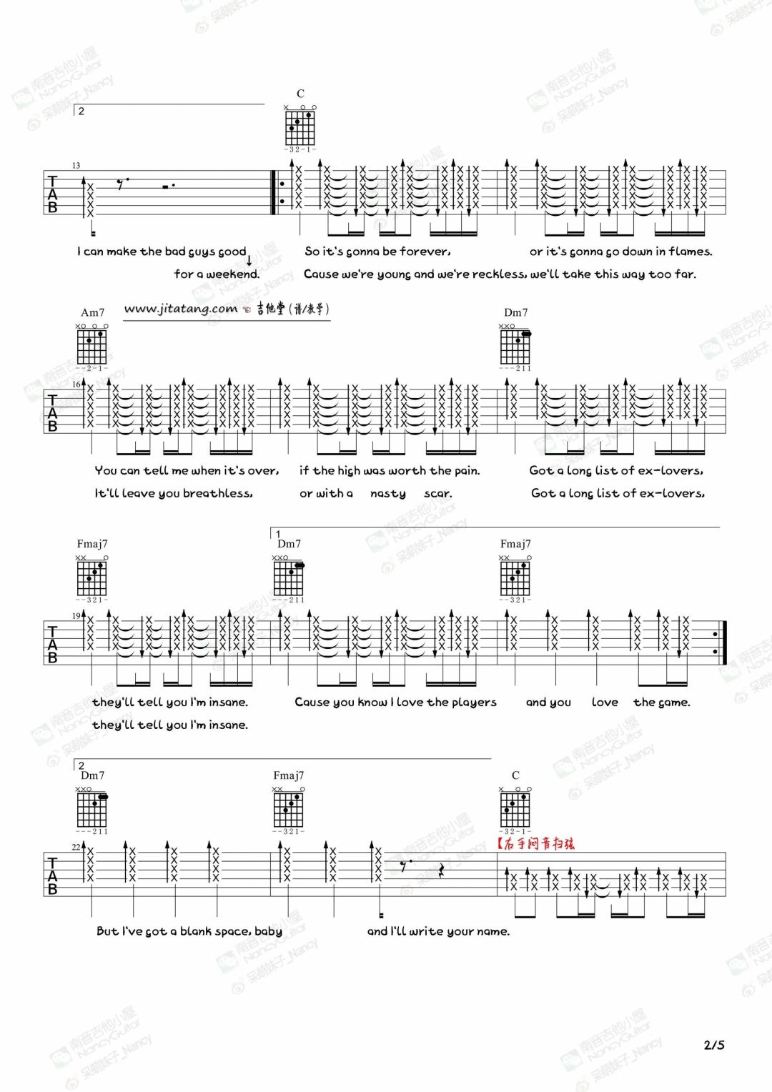 还记得那时候的自己才刚学了吉他,只认识几个简单的和弦,只会弹几首简单的民谣,但是自己又喜欢乱弹乱唱,又特别喜欢blank space,于是就上网找了这首歌的教程,发现了这首歌的前半段的和弦也不难,就学起来了,又开始了一系列的乱弹乱唱,就这样看着那个教程学习。
