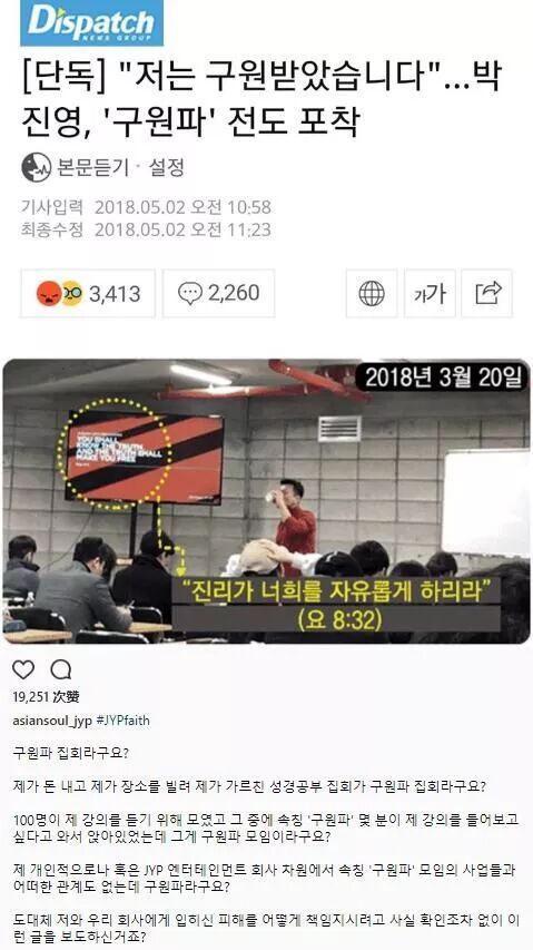 新闻曝光后,朴振英在SNS上否认,“你们说这是救援派的集会?我自己出钱、自己租场地教导学习圣经的集会是救援派集会?有100人为了听取我的讲课聚集在了一起,这其中有几位所谓“救援派”的人因为想听我讲的内容坐在了这里,这就是救援派的聚会?我个人也好,JYP公司也罢,都和所谓“救援派”组织没有任何关系,这也算是救援派吗?你们要如何负责对我以及我们公司所造成的损失?都没有确认过事实就做出这样的报道?我从四年前开始,便和朋友两个人每周会聚在一起两次学习圣经,后来再有朋友的朋友加入,这个朋友又带朋友来,大概就有了30个人左右的聚会,可这就是所谓的“救援派”组织吗?事已至此,我会上传我的信仰证明文件,大家不妨仔细看一看,如果这个内容中存在任何有违法律或伦理的问题,你们的报道就是合理的,可如果没有,你们将对我们造成的损失承担法律责任。”力证自己的清白。
